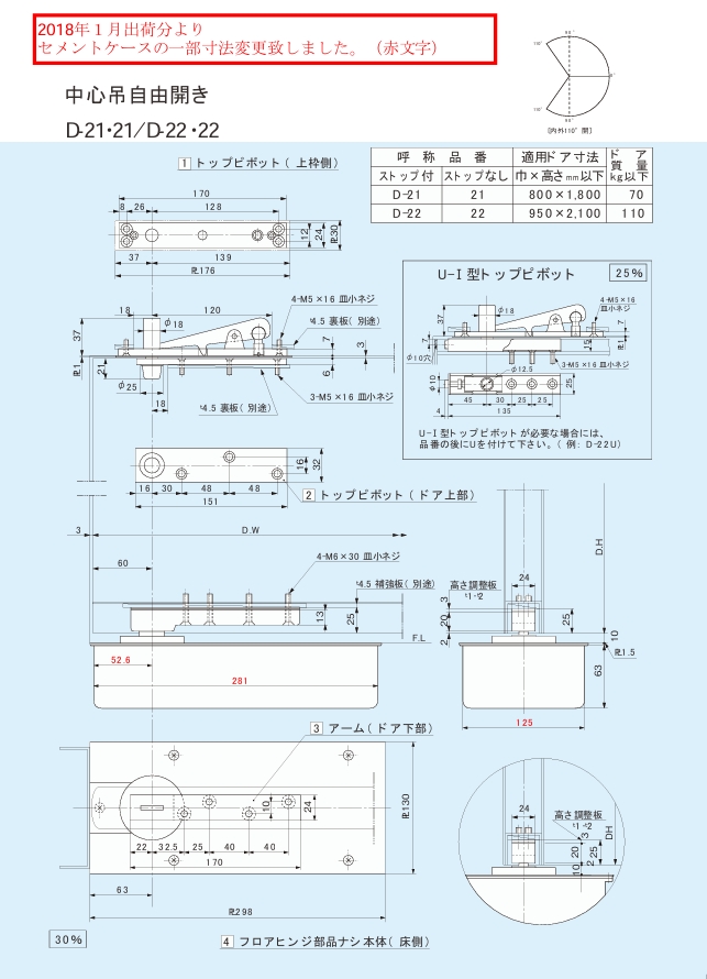 (上枠金具・ドア上部金具・ドア下部アーム・ヒンジ本体)